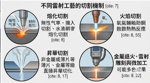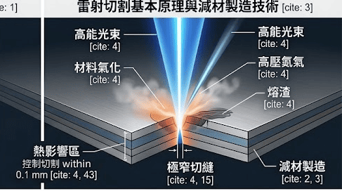 雷射切割加工的原理是利用高能量密度的雷射束,精準誘導材料瞬間熔融、氣化或達到燃點,並輔以高壓氣體吹除熔渣以達成切割 。與其他工法相比,這項技術具備以下不可取代的技術特性: